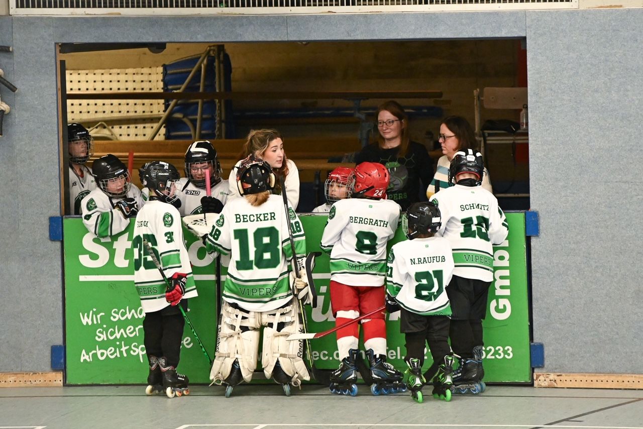 Die Aufstellung der Vipers: Nick Spier (Captain), Julian Schlag (Assistant), Lilly Becker (Goalie), Leon Bergrath, Arthur Weiß, Darijan Schmitz, Jannes Germann, Nele Raufuß, Mika Marzoli, Milan Winskowski, Jan Eurich, Lisa Andres, Pavel Barta, Nils Eckelmann, Quinn Marcoe, Amelie Cornett und Coco Lin mit ihrer Trainerin Pia Graziani, Co-Trainer Jan Esch und Betreuer Marijan Matjevic.