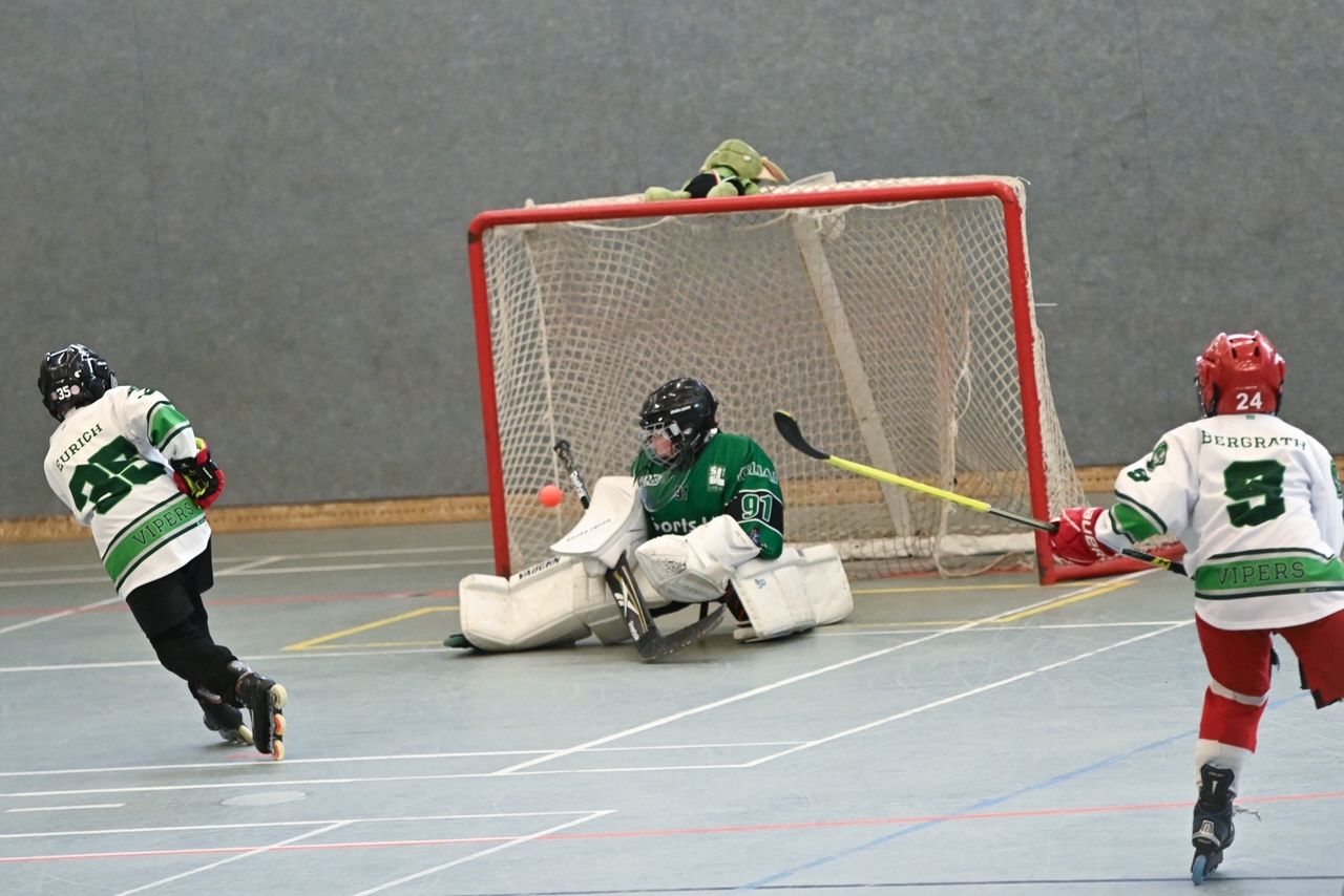 Die Monheimer starteten gekonnt in das Spiel und erzielten bereits im zweiten Wechsel das erste Tor. Dies steigerte die Motivation der Vipers. Sie erzielten den Ausgleich und gingen schließlich nach einigen hart umkämpften Minuten in Führung. Doch auch wenn das erste Drittel mit 3:1 für die Pulheimer endete, waren die Mannschaften leistungsmäßig gleich auf.